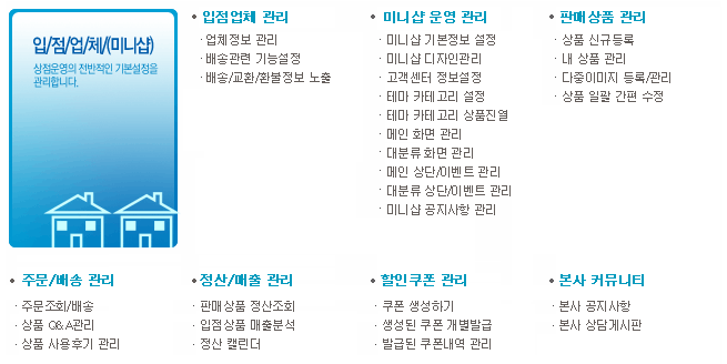 ÀÔÁ¡¾÷ü(¹Ì´Ï¼¥) ¸Þ´º Á¾ÇÕ¸ô°ú µ¿ÀÏÇÑ ¼öÁØÀÇ ÀÔÁ¡»ç ±â´É ¹× mall in mall ºÐ¾ç Á¤µµ±îÁö °¡´É Çϵµ·Ï ÇÑ´Ù. |